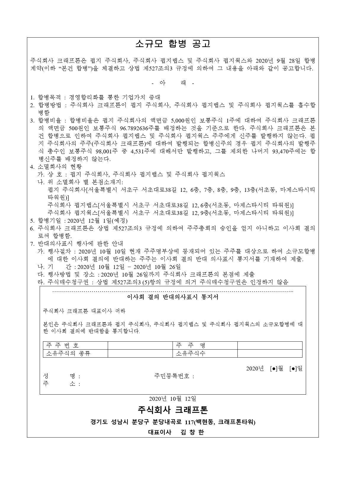 • 합병에 따른 채권자 이의 제출 공고