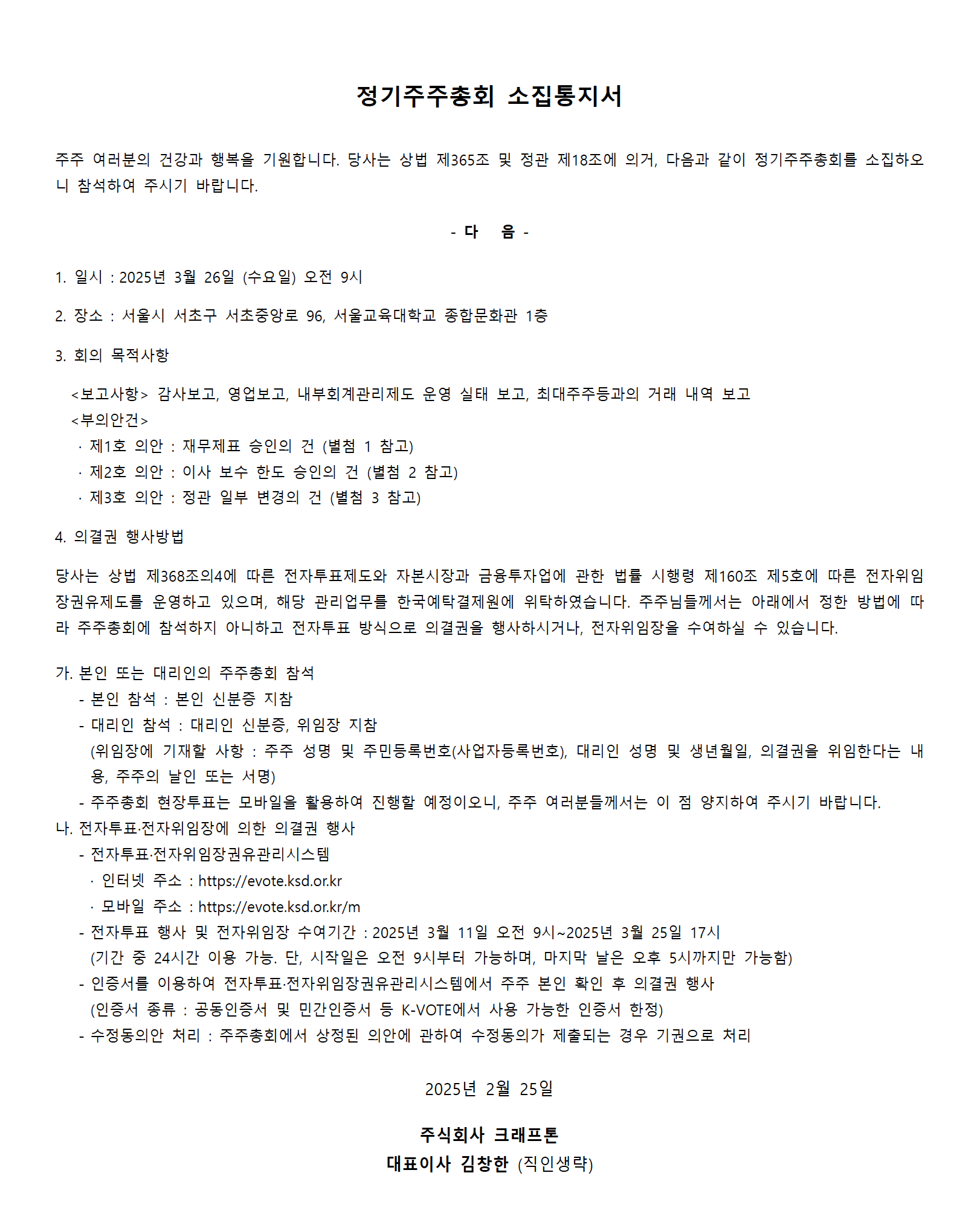 – 전자투표 행사 및 전자위임장 수여기간 : 2025년 3월 11일 오전 9시~2025년 3월 25일 17시