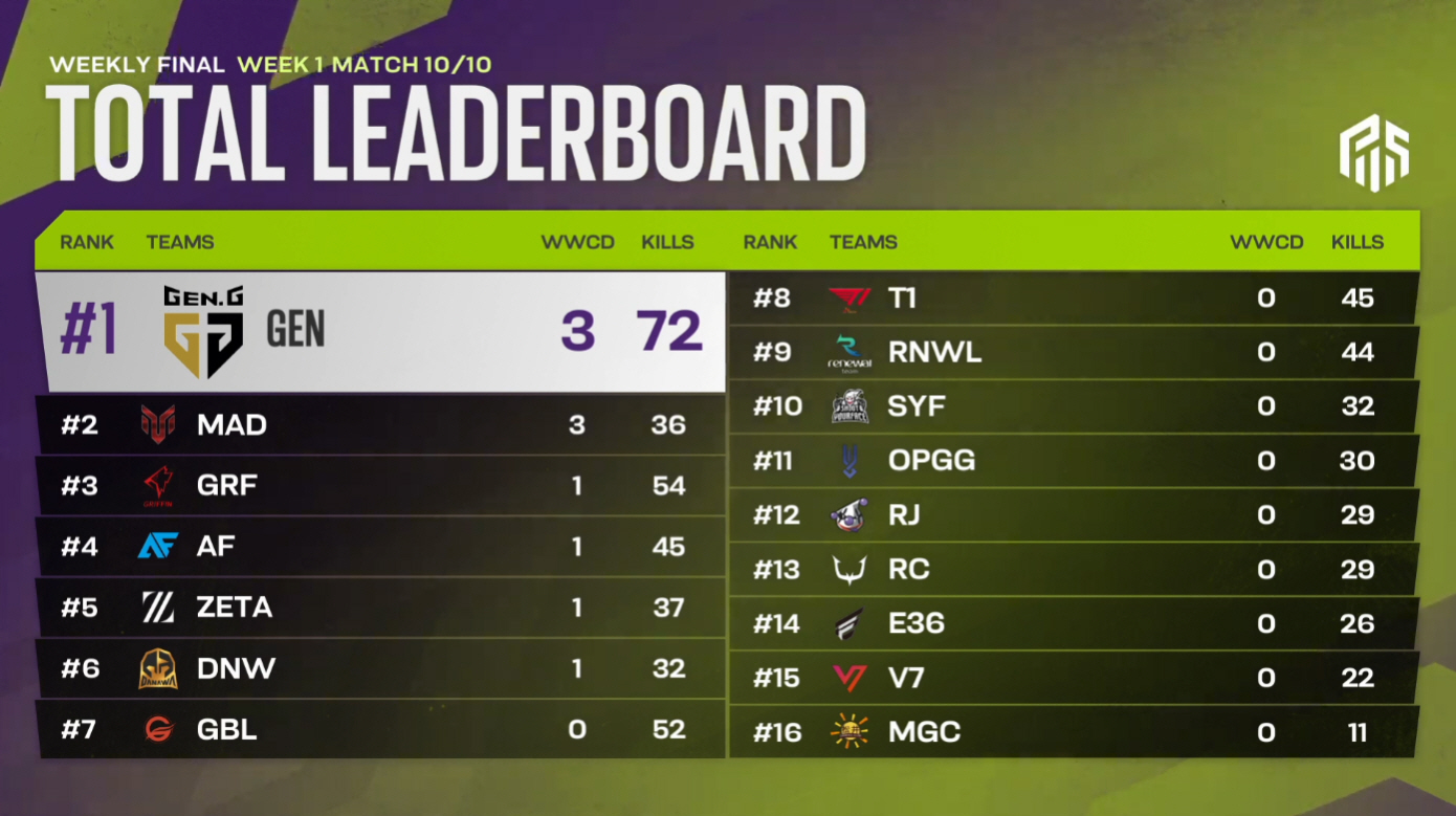 한국의 Gen.G(젠지)가 위클리 파이널에서 3치킨 72킬을 기록하며 1주 차 승리팀 영예를 차지했다. 1일 차에 3치킨을 획득한 Gen.G는 최다 킬을 기록하며 MaD Clan(매드 클랜)을 따돌리고 1위를 확정했다.